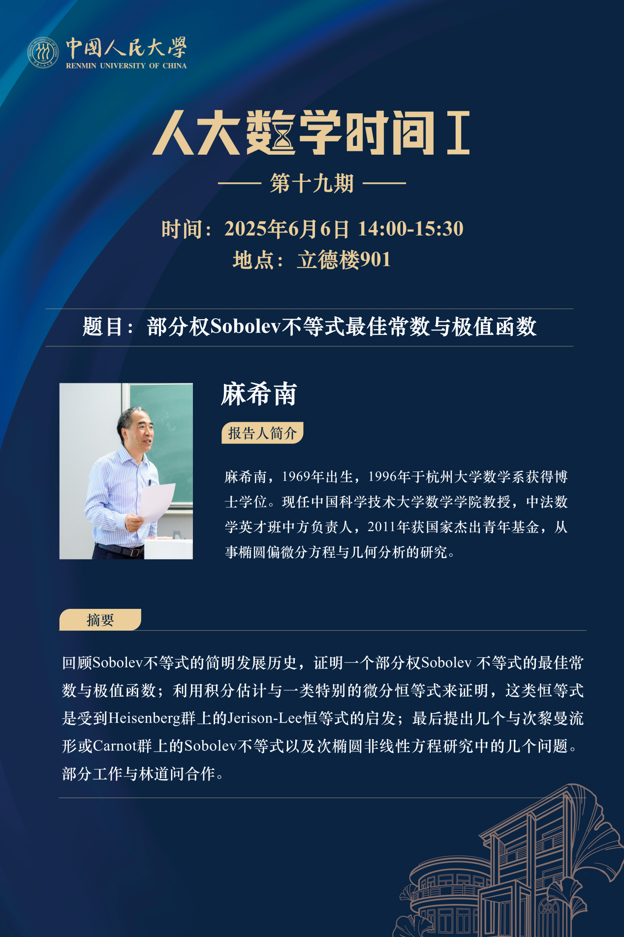 为促进学科交流融合、拓宽师生学术视野、释放科研创新活力,助力人大数学学科走向一流,13av 设立“人大数学时间”,以专题研讨、高端学术论坛为载体,搭建数学思想充分碰撞、优秀人才不断涌流、创造活力竞相迸发的舞台。“人大数学时间”将持之以恒,久久为功,立志通过交流与创新、提出重大问题,引领数学学科及相关领域的创新与发展,成为对我国数学发展有贡献意义的平台。以下为“人大数学时间I”第十九期信息: