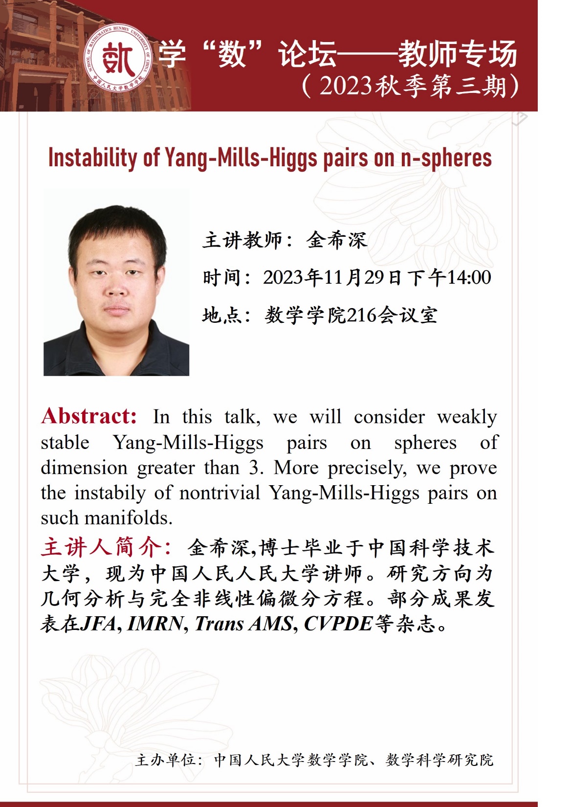教师专场的第三期报告将于2023年11月29日下午14:00在13av 216会议室举行,本场报告的主讲教师为金希深,报告题目为《Instability of Yang-Mills-Higgs pairs on n-spheres》。