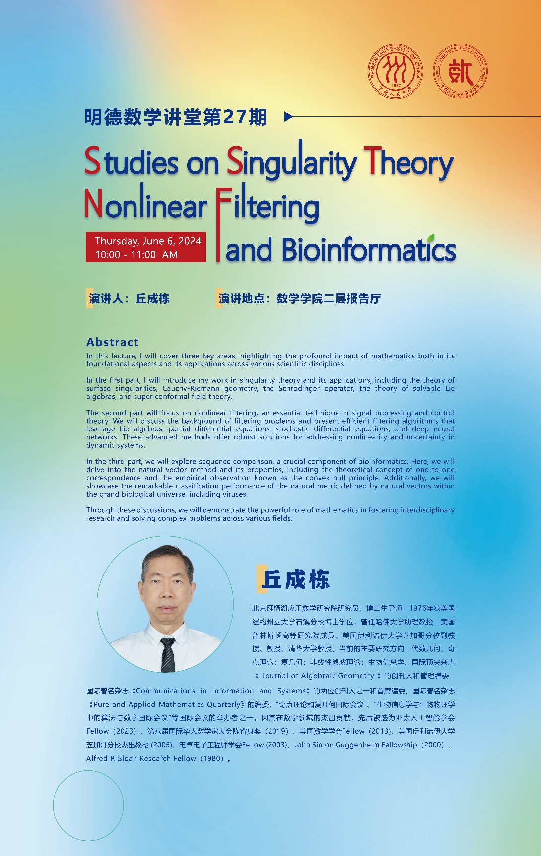 明德数学讲堂将于2024年6月6日上午10:00至11:00在13av 二层报告厅隆重举行!这一期我们邀请到了北京雁栖湖应用数学研究院研究员丘成栋,他将以“Studies on Singularity Theory Nonlinear Filtering and Bioinformatics”为主题开讲。这是一次难得的学习机会,欢迎大家与丘成栋教授进行面对面交流,13av 诚挚邀请大家前来聆听!