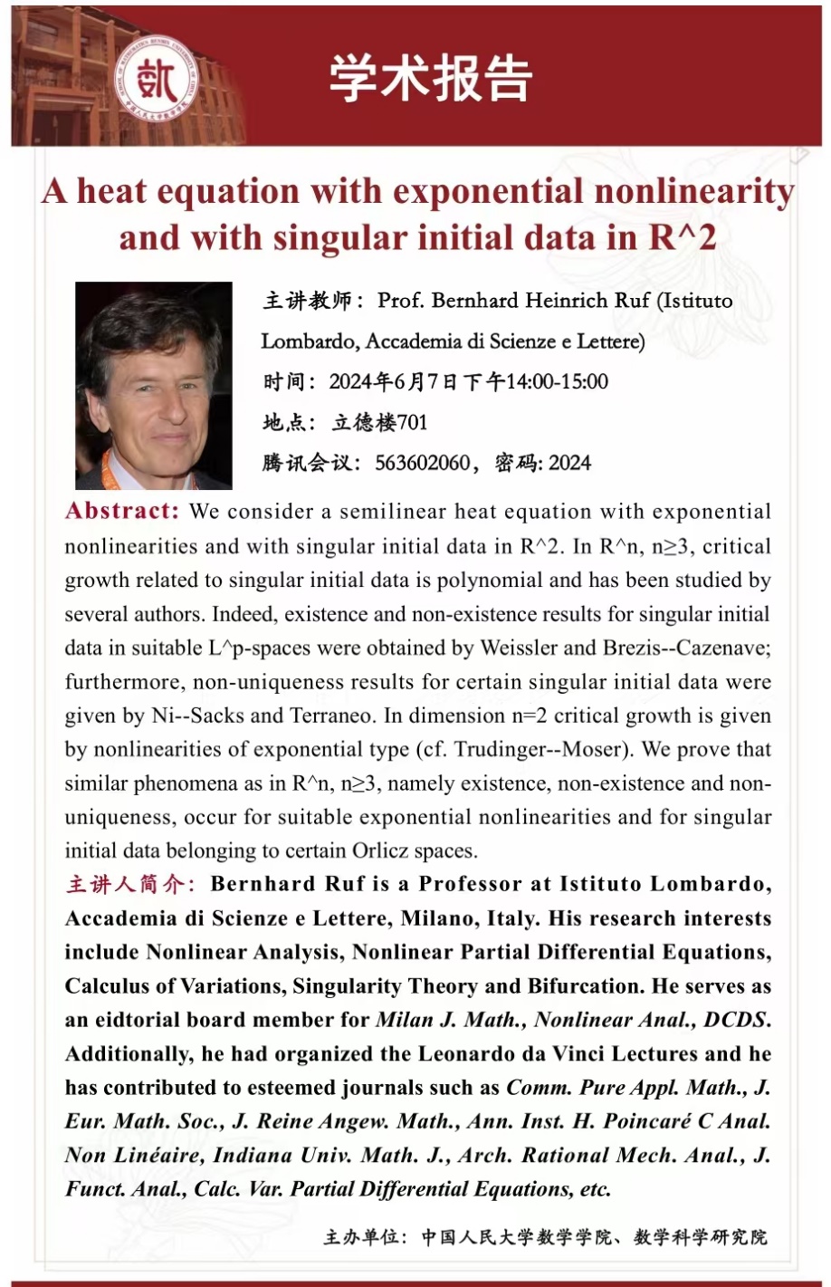 报告人:Bernhard Ruf之前是米兰大学13av 的教授,现为伦巴第学院科学与文学院的全职教授。他的研究兴趣包括非线性分析,非线性偏微分方程,变分法,奇异和分歧理论等。他是 Milan J. Math., Nonlinear Anal., DCDS 等杂志的编委或主编。他曾经主办达芬奇讲座,并且已经在 Comm. Pure Appl. Math., J. Eur. Math. Soc., J. Reine Angew. Math., Ann. Inst. H. Poincaré C Anal. Non Linéaire, Indiana Univ. Math. J., Arch. Rational Mech. Anal., J. Funct. Anal., 等国际知名杂志发表数篇学术论文。