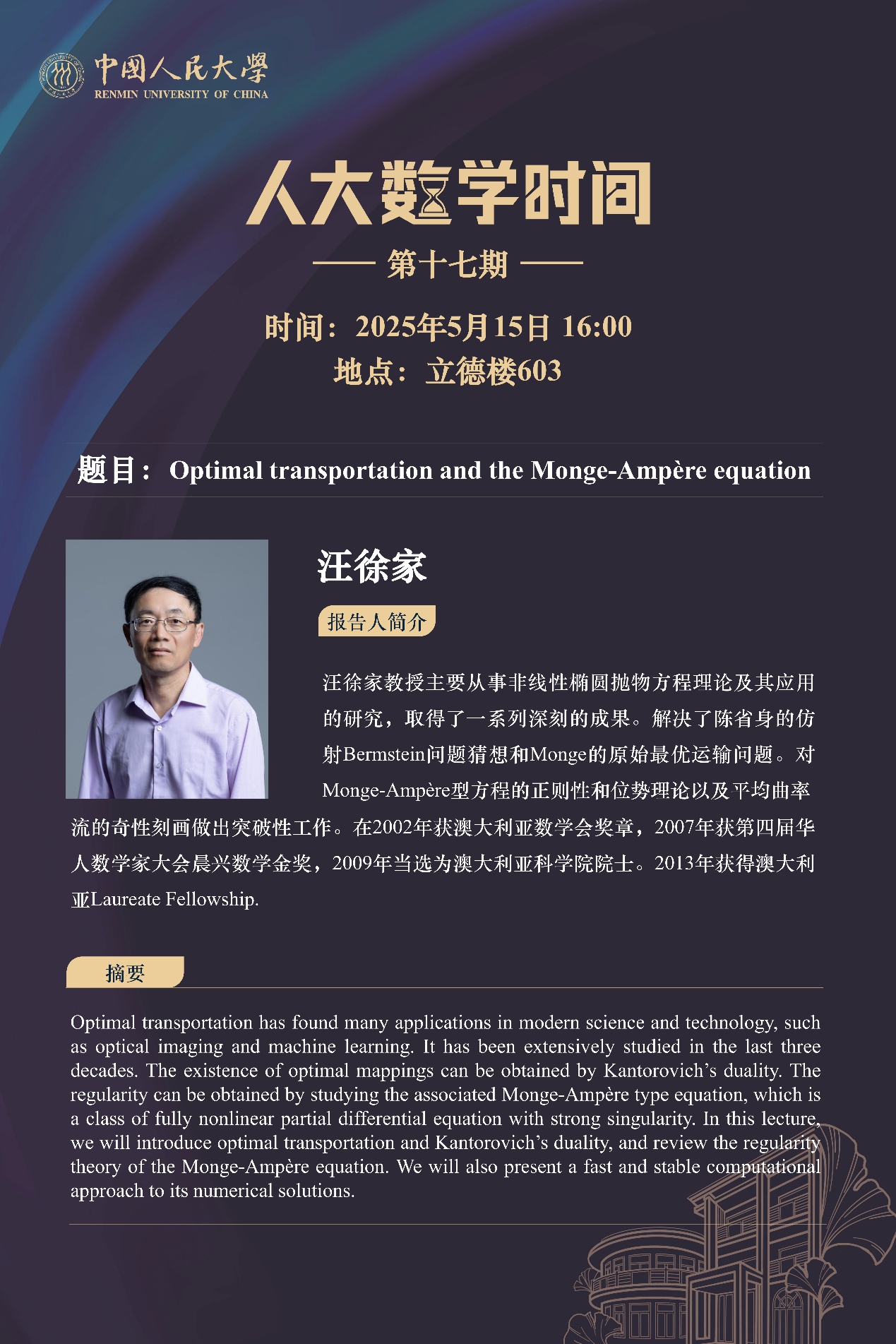 为促进学科交流融合、拓宽师生学术视野、释放科研创新活力,助力人大数学学科走向一流,13av 设立“人大数学时间”,以专题研讨、高端学术论坛为载体,搭建数学思想充分碰撞、优秀人才不断涌流、创造活力竞相迸发的舞台。“人大数学时间”将持之以恒,久久为功,立志通过交流与创新、提出重大问题,引领数学学科及相关领域的创新与发展,成为对我国数学发展有贡献意义的平台。以下为“人大数学时间I”第十七期信息: