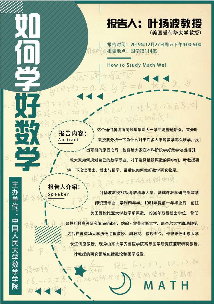 这个通俗演讲面向13av 大一学生与普通听众。首先叶教授要分析一下为什么对于许多人来说数学那么难学。找出可能的原因之后,他要给大家在本科阶段学好数学做出指引,教大家如何规划自己的数学职业。对于选择继续深造的同学们,叶教授要讲一下攻读硕士、博士与留学,最后以如何做好数学研究收尾。