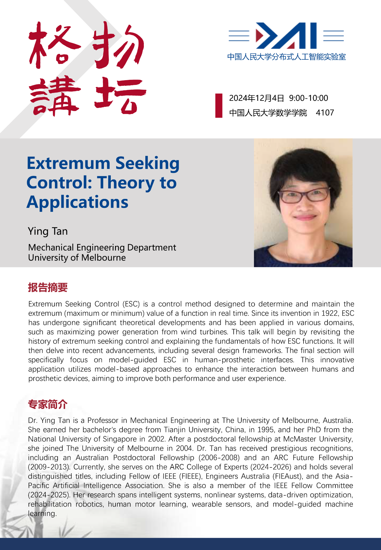 Dr. Ying Tan is a Professor in Mechanical Engineering at The University of Melbourne, Australia. She earned her bachelor's degree from Tianjin University, China, in 1995, and her PhD from the National University of Singapore in 2002. After a postdoctoral fellowship at McMaster University, she joined The University of Melbourne in 2004. Dr. Tan has received prestigious recognitions, including an Australian Postdoctoral Fellowship (2006-2008) and an ARC Future Fellowship (2009-2013). Currently, she serves on the ARC College of Experts (2024-2026) and holds several distinguished titles, including Fellow of IEEE (FIEEE), Engineers Australia (FIEAust), and the Asia-Pacific Artificial Intelligence Association. She is also a member of the IEEE Fellow Committee (2024-2025). Her research spans intelligent systems, nonlinear systems, data-driven optimization, rehabilitation robotics, human motor learning, wearable sensors, and model-guided machine learning.