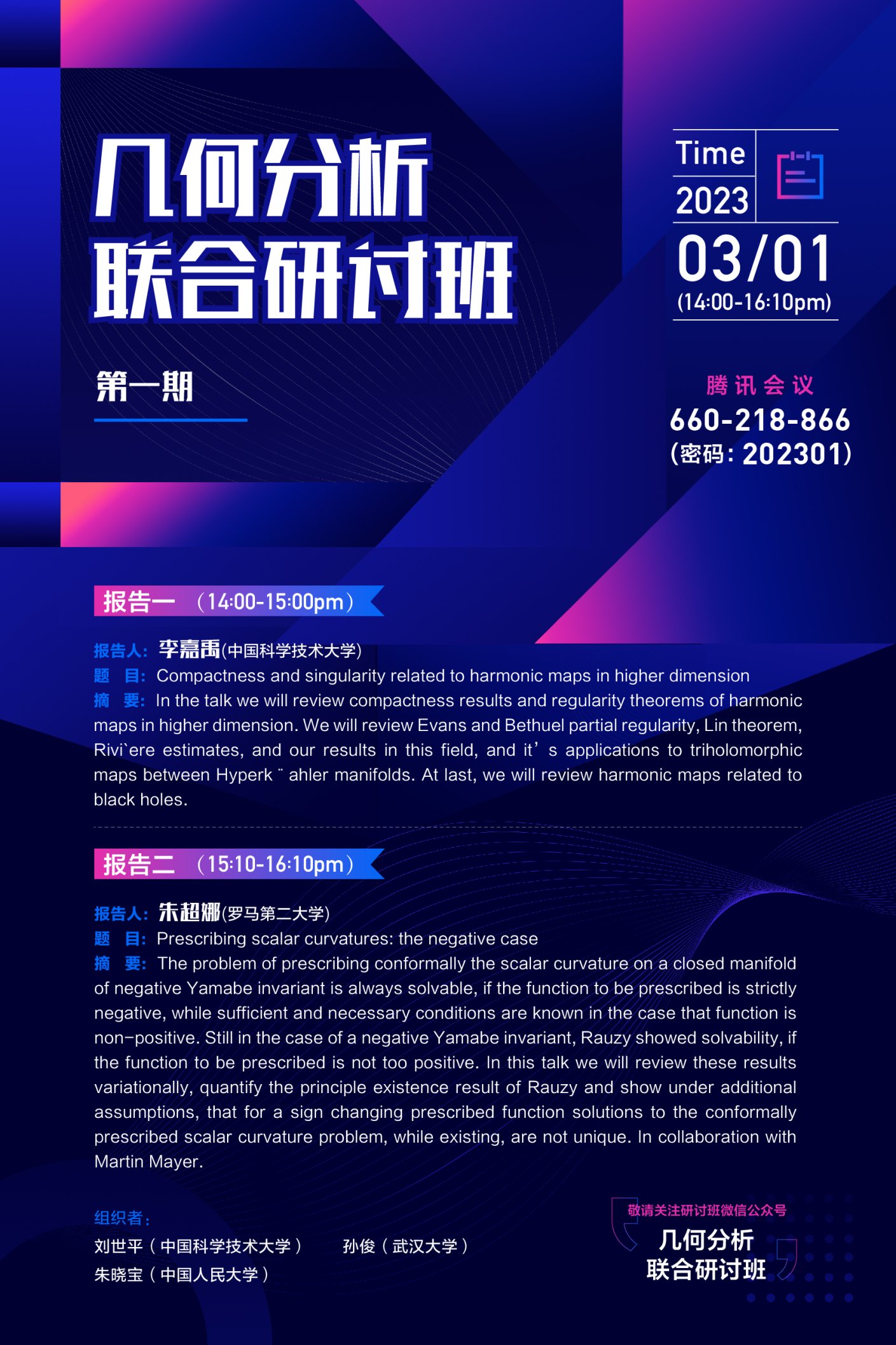 本次几何分析联合研讨班由我院朱晓宝老师、中国科学技术大学刘世平老师和武汉大学孙俊老师联合组织,欢迎感兴趣的老师和同学前来聆听学习!