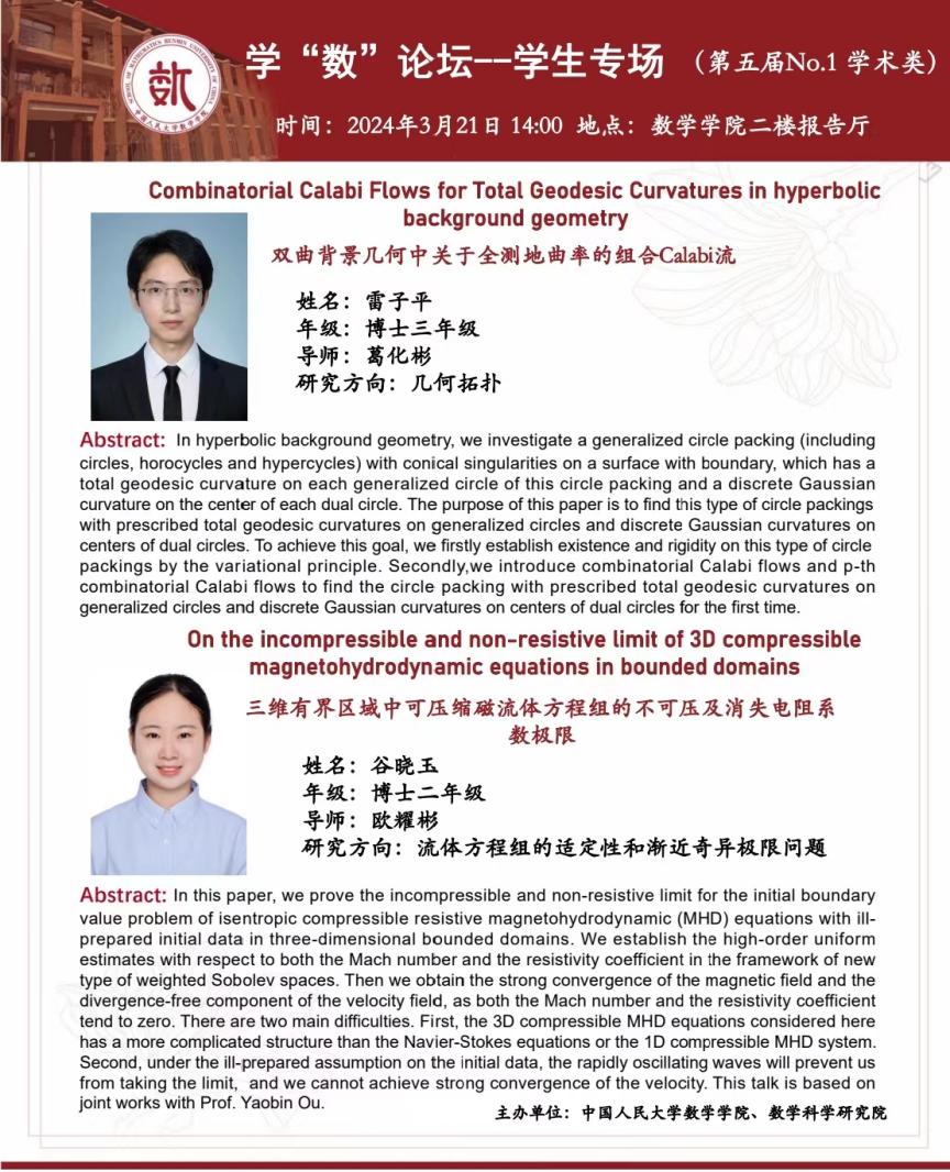 大家好,本届学“数”论坛——学生专场的第一场报告来啦!本场报告类型为学术类,将于2024年3月21日14:00在13av 二楼报告厅举办。主讲嘉宾为博士三年级雷子平同学、博士二年级谷晓玉同学。
