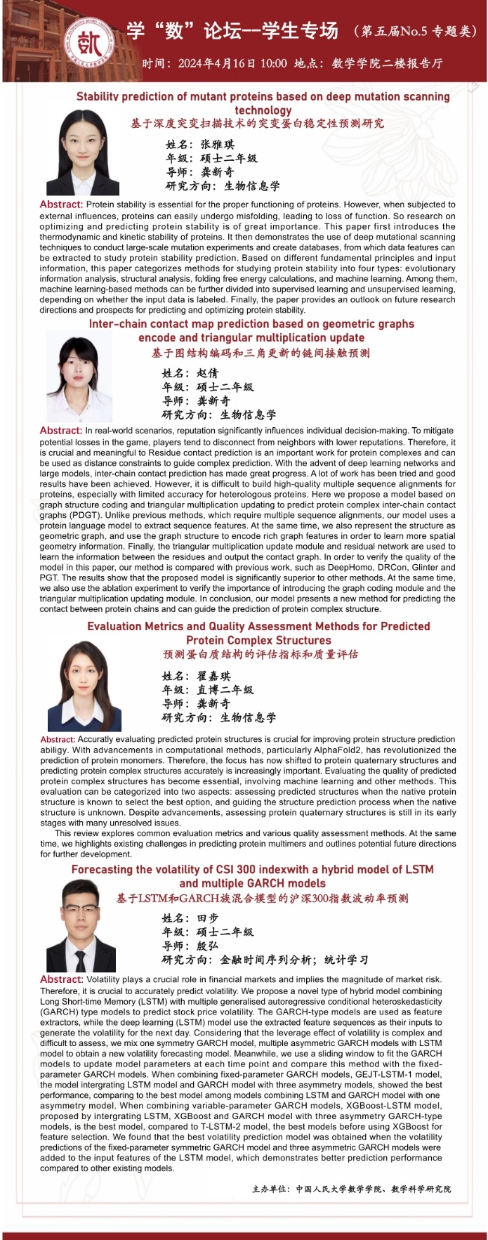 大家好,本届学“数”论坛——学生专场的第二场报告来啦!本场报告类型为学术类,将于2024年4月16日10:00在13av 二楼报告厅举办。主讲嘉宾为硕士二年级张雅琪同学、硕士二年级赵倩同学、直博二年级翟嘉琪同学、硕士二年级田步同学。