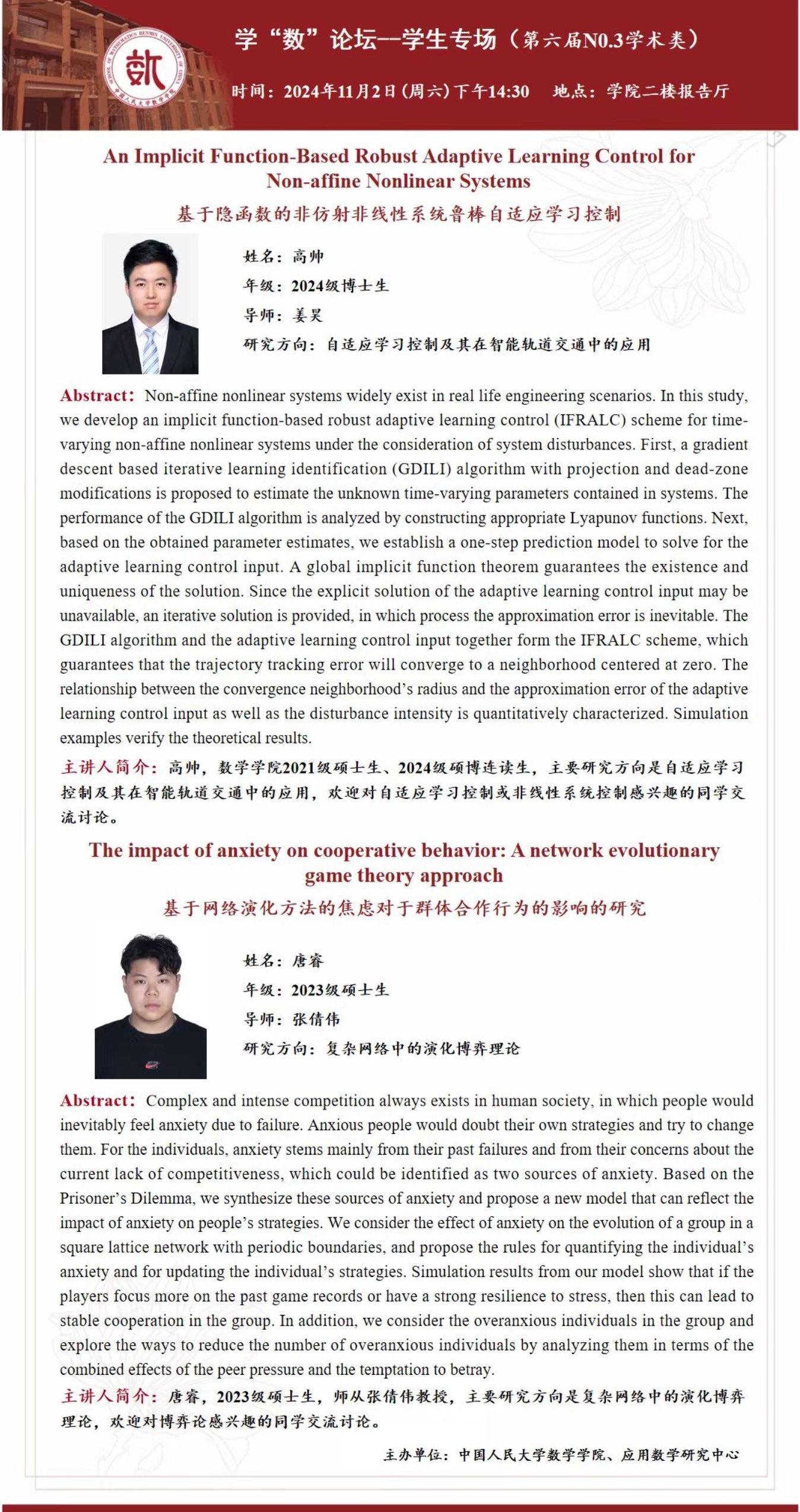 本场报告类型为学术类,将于2024年11月2日(星期六)下午14:30,在13av 二楼报告厅进行,报告主讲人为2024级硕博连读生高帅同学和2023级硕士生唐睿同学。