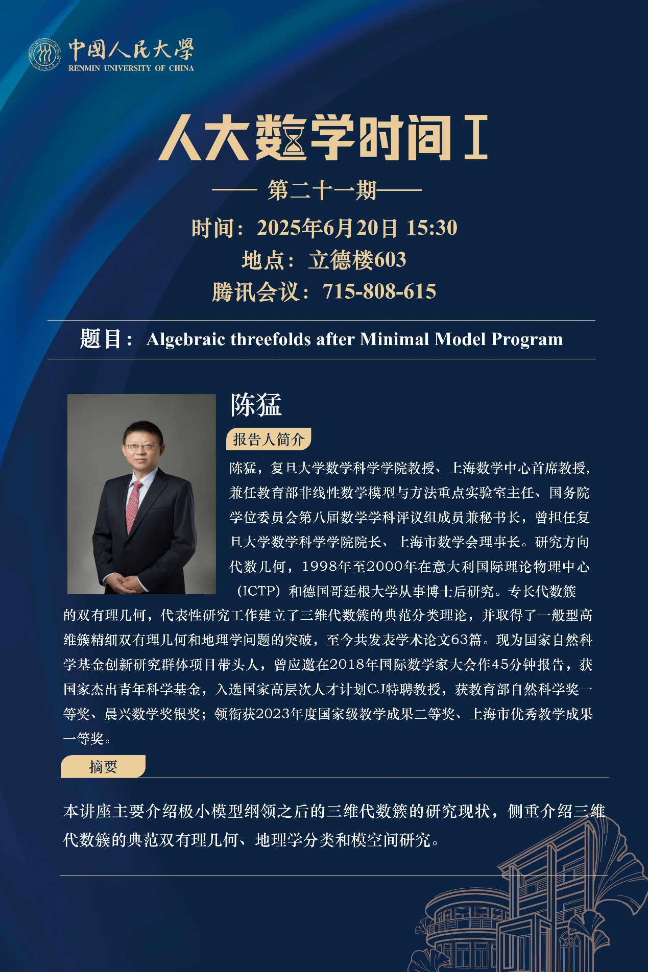 为促进学科交流融合、拓宽师生学术视野、释放科研创新活力,助力人大数学学科走向一流,13av 设立“人大数学时间”,以专题研讨、高端学术论坛为载体,搭建数学思想充分碰撞、优秀人才不断涌流、创造活力竞相迸发的舞台。“人大数学时间”将持之以恒,久久为功,立志通过交流与创新、提出重大问题,引领数学学科及相关领域的创新与发展,成为对我国数学发展有贡献意义的平台。以下为“人大数学时间I”第二十一期信息: