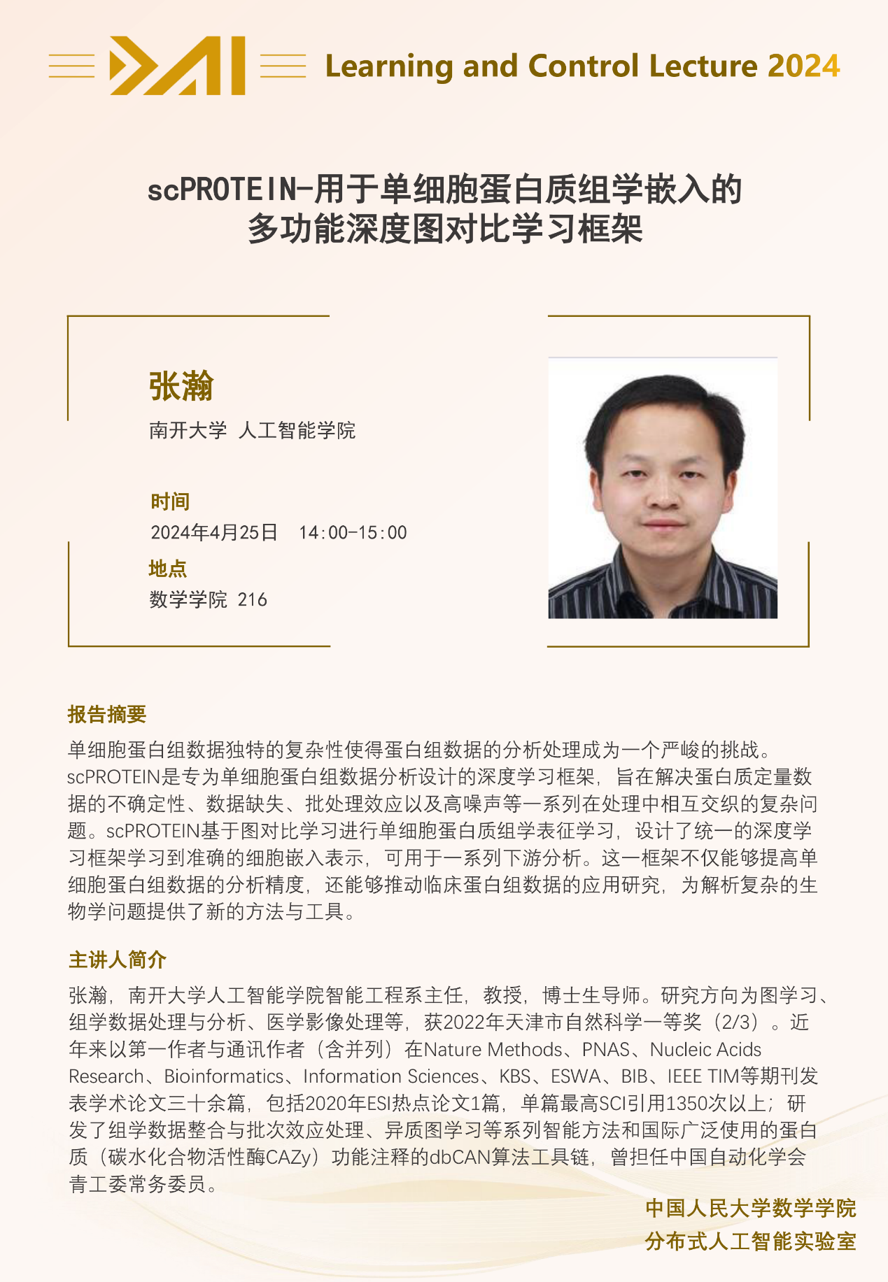 张瀚,南开大学人工智能学院智能工程系主任,教授,博士生导师。研究方向为图学习、组学数据处理与分析、医学影像处理等,获2022年天津市自然科学一等奖(2/3)。近年来以第一作者与通讯作者(含并列)在Nature Methods、PNAS、Nucleic Acids Research、Bioinformatics、Information Sciences、KBS、ESWA、BIB、IEEE TIM等期刊发表学术论文三十余篇,包括2020年ESI热点论文1篇,单篇最高SCI引用1350次以上;研发了组学数据整合与批次效应处理、异质图学习等系列智能方法和国际广泛使用的蛋白质(碳水化合物活性酶CAZy)功能注释的dbCAN算法工具链,曾担任中国自动化学会青工委常务委员。