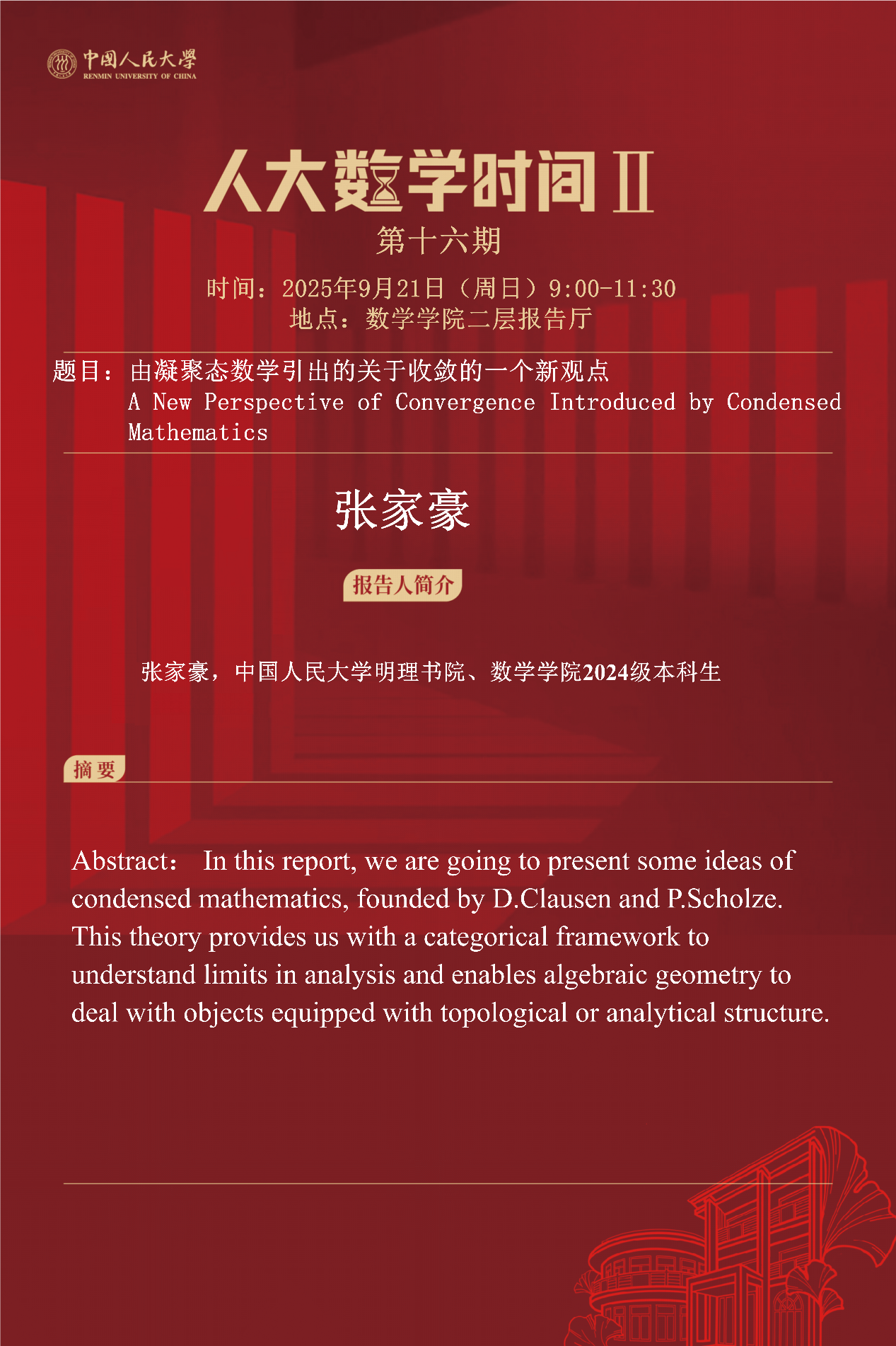 “人大数学时间 II”由13av 主办,明理书院协办,致力于打造一个真诚纯粹的学生学术交流平台。在这里,我们鼓励每位学生以独特的视角引领深入讨论,重在提出问题,从而激发思考与创新。我们注重的是提升学术纯度,而不是增加难度。这个平台不仅是数学讨论的空间,更是孕育伟大梦想的摇篮。