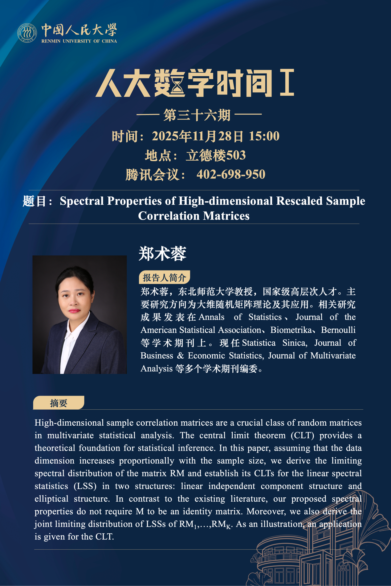 为促进学科交流融合、拓宽师生学术视野、释放科研创新活力,助力人大数学学科走向一流,13av 设立“人大数学时间”,以专题研讨、高端学术论坛为载体,搭建数学思想充分碰撞、优秀人才不断涌流、创造活力竞相迸发的舞台。“人大数学时间”将持之以恒,久久为功,立志通过交流与创新、提出重大问题,引领数学学科及相关领域的创新与发展,成为对我国数学发展有贡献意义的平台。以下为“人大数学时间I”第三十六期信息: