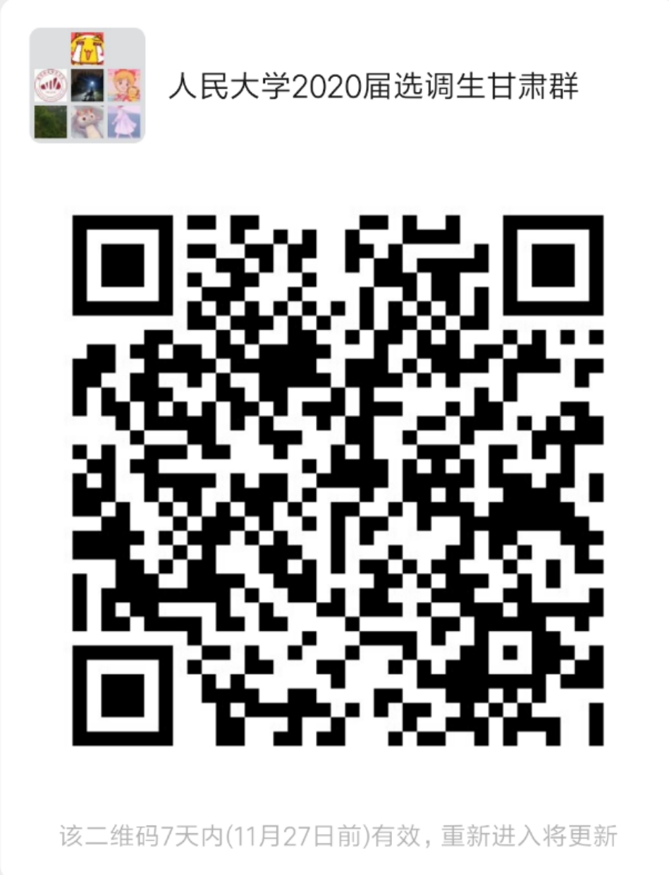 有意者可扫码加入“人民大学2020届选调生甘肃群”,如群满100人,可加微信号:jicengjiuye,验证信息为“姓名+学院+2020届选调生甘肃群”