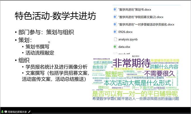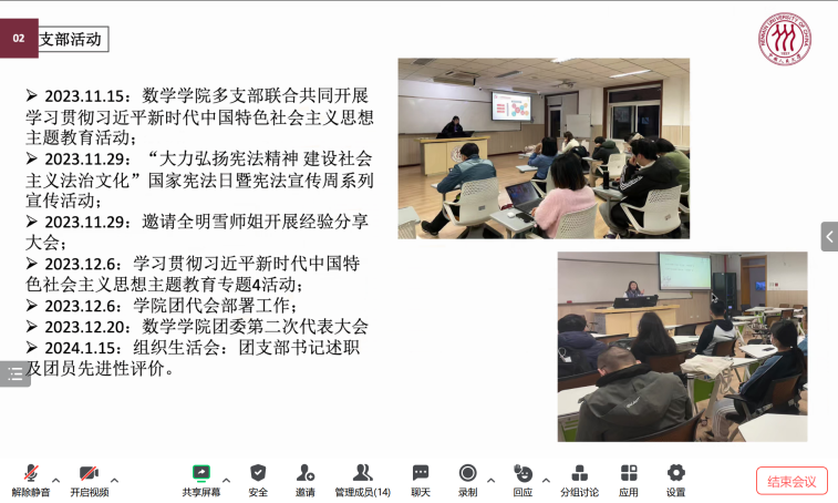 述职会上,本硕博各班团代表从班级工作开展基本情况、班级特色活动和工作成果、班级工作体会和工作建议三个方面进行总结述职,既展现出各具特色的班级面貌和班级同学风采,又呈现了数院学子昂扬积极的生活面貌,各班也在交流中不断吸纳优秀经验,为新学期更好开展班级活动、增强班级凝聚力奠定基础。