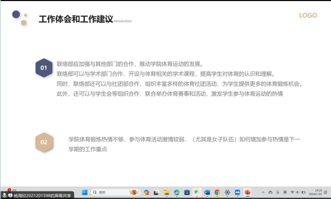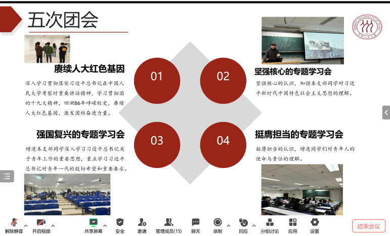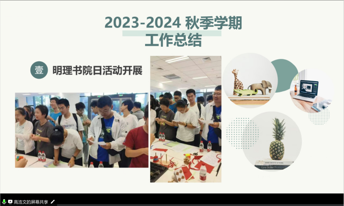 分团委、学生会、新媒体中心、研究生会、党建促进会主席团成员先后从负责组织的基本情况、部门工作成果及特色活动、个人工作心得及建议等方面进行了学期工作的总结汇报,并结合工作开展情况,对新学期的工作进行了规划和展望,力求在做好常规工作的同时探索更丰富的工作形式与工作内容,调动提高同学们参与学院活动的积极性。