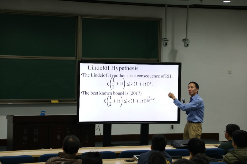 叶扬波教授首先从微积分调和级数引出Riemann zeta function,分析了Riemann zeta function和素数的关系,并提出可以用级数的敛散性证明素数有无穷多个。同时,从复分析的角度分析了素数的表达。他用通俗的语言向非数论专业的老师与同学介绍黎曼猜想的提出、掌故、推论、难度、进展和可望的证明思路。最后,叶扬波教授总结了三点:一、我们距离黎曼猜想的证明还有很远的路要走;二、所有已发表的关于黎曼猜想的证明都存在缺陷;三、在通向黎曼猜想的证明之路上,数学家已经取得了很大的成就。