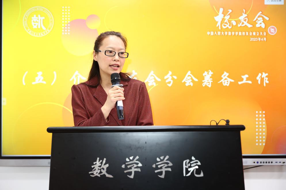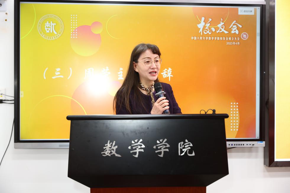 然后由周荣主任致辞,她向大家说明了校友联系及校友工作的基本情况,并介绍学校对校友会工作提出的方针:扶上马,送上程,关爱一生。周荣主任依照自己的工作经验,向大家推荐了不同形式的校友活动,比如重返课堂、亲有活动等,她表示,3年疫情期间,许多校友没有机会回到母校温暖的怀抱,寒冬已过,春天已到,数院校友会成立恰逢其时,欢迎各位校友多到母校参加活动。