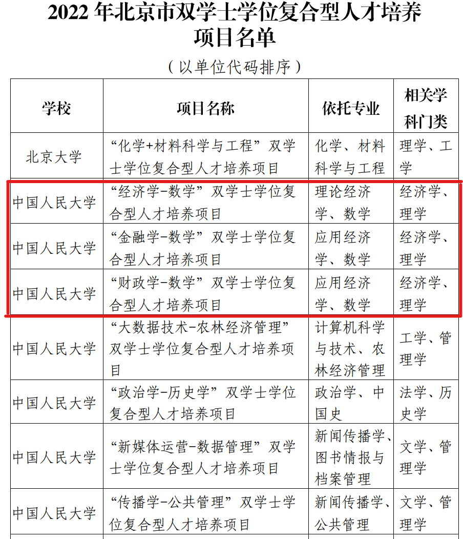 近日,北京市学位委员会发布了2022年度双学士学位复合型人才培养项目及联合学士学位项目名单,我院申报的三个项目“经济学-数学”、“金融学-数学”、“财政学-数学”入选2022年北京市双学士学位复合型人才培养项目。