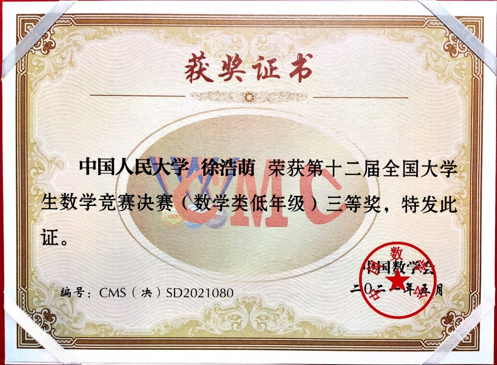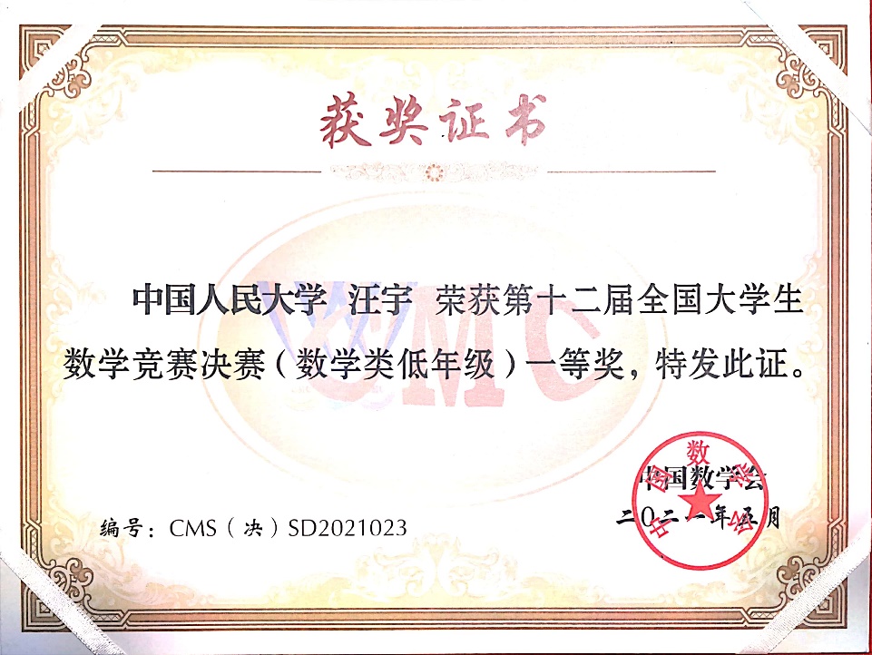 第12届全国大学生数学竞赛决赛于2021年5月16日在吉林大学成功落下帷幕。本次竞赛全国共有32个赛区206921人报名参加初赛,从中选拔出668人进入决赛,实际参赛人数646人,其中,数学专业组343人(高年级组223人,低年级组120人),非数学专业组303人。13av 2019级数学拔尖人才实验班的汪宇同学和徐浩萌同学晋级北京赛区全国总决赛(北京赛区共28名学生入围),并在此次决赛中获得优异成绩,其中汪宇同学获得低年级组全国一等奖(全国共24名同学获得该等级奖),徐浩萌同学获得低年级组全国三等奖(全国共59名同学获得该等级奖)。这是我校第二次组织全校本科生参赛,首次入围全国总决赛并获得优异成绩,这份喜人的成绩必将激励更多我校本科生积极参赛。