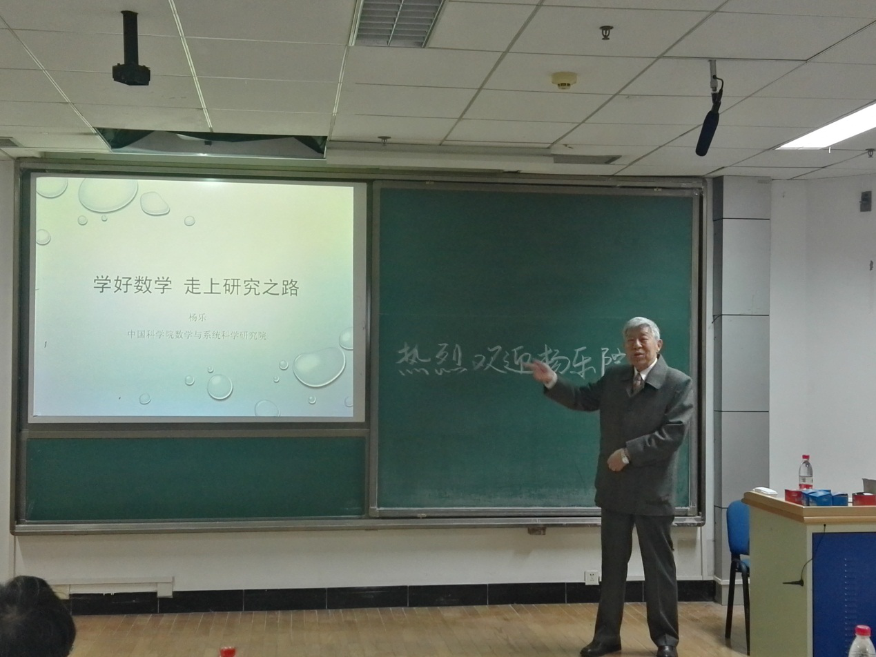 杨乐院士谈到学习数学要在严谨推理的基础上认真思考,揭示实质,掌握原始思想,让学习带上研究的性质。对开始从事研究工作的同学,从如何选题,阅读文献,刻苦攻关,扩大战果,撰写论文等环节分别进行讨论。在此次演讲里,同学们受到了完整的研究过程的训练。