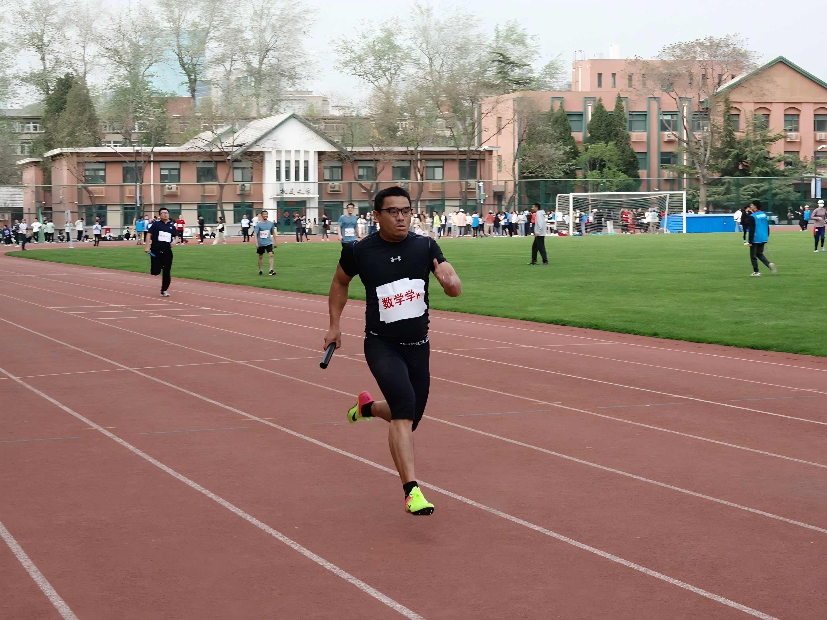 随着发令枪响,迎来了最后的压轴项目—4x100混合接力赛。本次接力赛中,我院派出郭琪、缪亭如、赵春晓、张良泉四位教师参战。各位选手如离弦之箭冲出,弯道处展开速度博弈,交接棒配合默契。随着最后一棒冲过终点,啦啦队的呐喊声已冲破云霄,将数学人的集体荣誉感推向高潮,我院最终取得了全校第四名的优秀成绩。