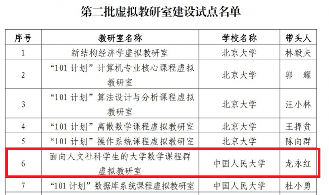 近日,教育部发布了第二批虚拟教研室建设试点名单。我院龙永红教授主持的“面向人文社科学生的大学数学课程群虚拟教研室”入选第二批国家级虚拟教研室建设试点。