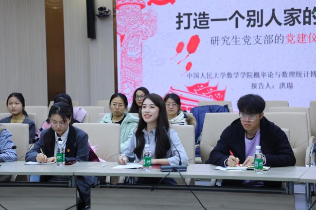 会后,师生分组研讨。教师分会场两校四院的领导老师围绕“党建+人才培养”讨论沟通经验、互学所长,为未来进一步的交流合作搭建了坚实桥梁。学生分会场围绕学生党支部建设和学生品牌活动展开,进行交流和经验分享。我院概率论与数理统计博士生第一党支部书记洪瑒同学作为代表,向与会人员介绍了她所在“样板党支部”的工作情况。学生骨干积极提问探讨,商讨联合开展主题活动等,氛围热烈,为两校四院的学生骨干相互学习、共同提升开辟了崭新路径。