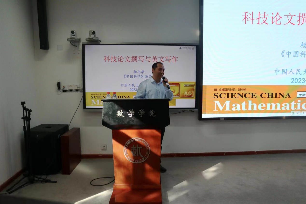 杨志华教授是中国科学技术期刊编辑学会青年工作委员会委员,曾获中国科学院《中国科学》《科学通报》优秀编辑、中国科技期刊卓越行动计划优秀编辑等奖项。他所负责的《中国科学:数学》 (中、英文刊)是我国最具影响力和代表性的数学综合性学术期刊。在本次讲座中,他结合自己的工作经历,聚焦学术论文写作方法这一广泛受到关注的问题,向同学们作了深入浅出地讲解,并提出了自己的建议。