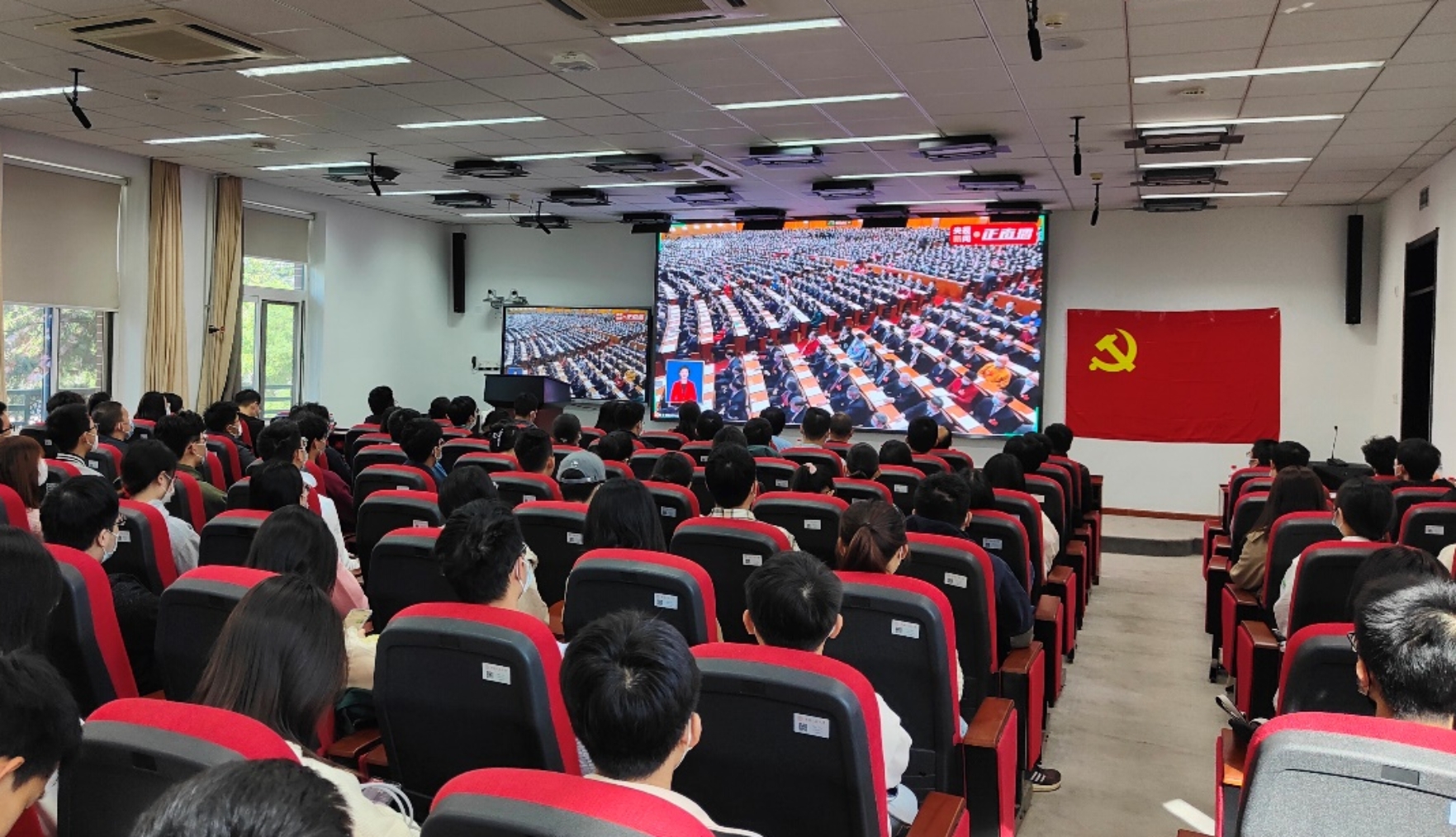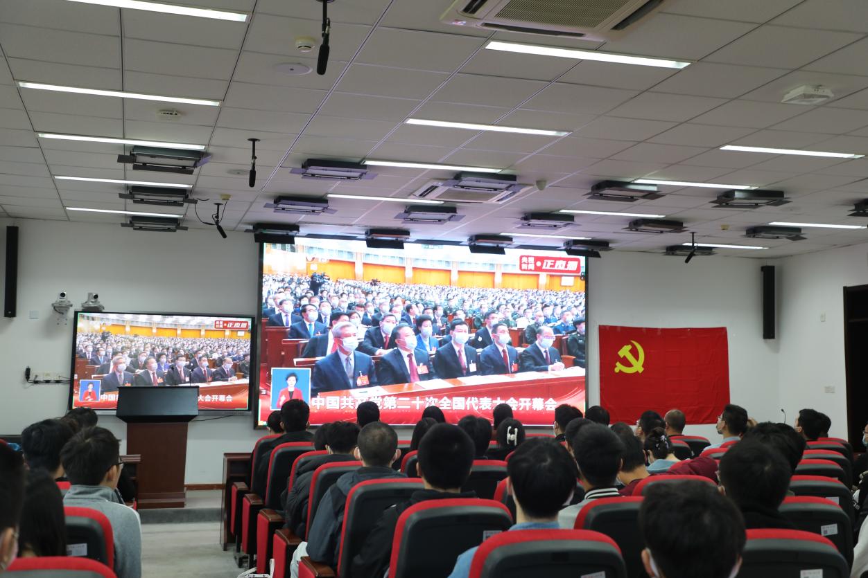 随着中国共产党第二十次全国代表大会开幕,线下会场同志们全体起立,高唱国歌,并为已故老一辈无产阶级革命家和革命先烈默哀。全体师生仔细聆听习近平总书记代表十九届中央委员会向大会作报告,报告高瞻远瞩、振奋人心,提出了一系列重要思想、重要观点、重大判断、重大举措,展示了党和国家未来发展的美好前景。大家聚精会神,认真聆听,不时报以热烈掌声。