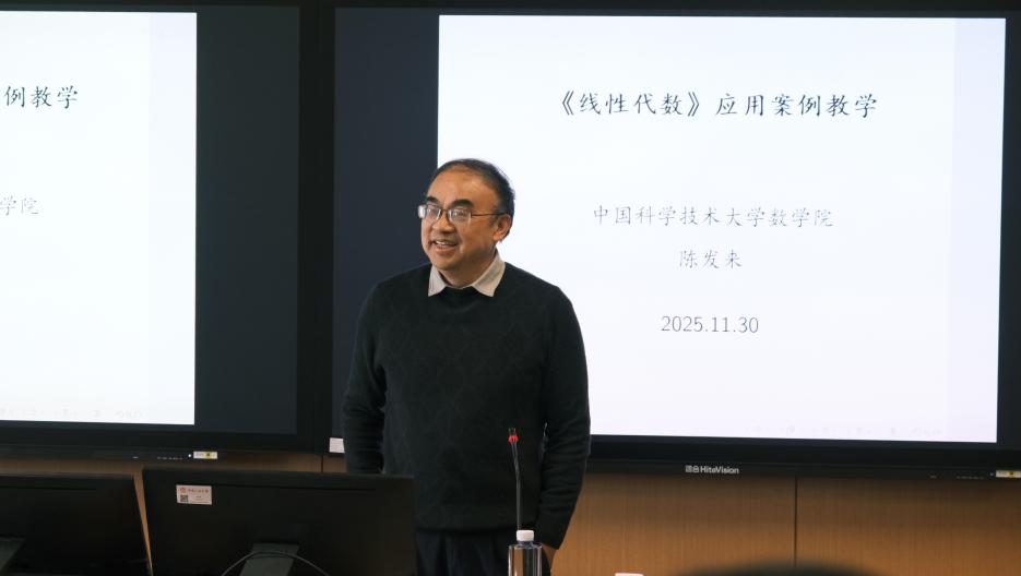 2025年11月30日上午,中国科学技术大学数学院教授、博士生导师陈发来应13av 邀请,在中关村校区立德楼303教室作“线性代数应用案例教学”专题讲座。