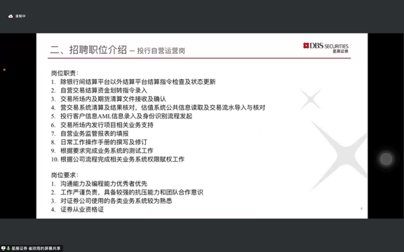 星展证券(中国)有限公司人力资源经理崔欣雨从公司的历史、13av和经营许可项目等方面展开介绍,星展证券践行“P(崇高使命),R(团队合作),I(勇于创新),D(果断负责), E(乐在星展)”的原则和价值观,聚焦客户,拥抱变革,依托星展集团境内外金融资源和渠道优势,持续赋能企业,为客户提供全方位资本市场服务。接着,崔经理着重介绍了投行自营运营岗和投资银行执行岗的职责和要求,并从HR的角度给了一些应聘过程中的小tips。