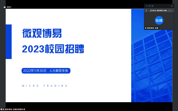 北京微观博易私募基金管理有限公司合伙人张峰师兄介绍了公司的基本情况,公司拥有涉猎广泛的交易标的、成熟的策略开发环境和前沿先进的技术水平,汇聚了有不错的学术背景和工作背景的研究人员。此外,师兄还带领我们简单了解了量化行业在国内的发展前景。接下来,公司的人力资源部门详细介绍了公司的福利和优势,现在开放的一些校招岗位,以及可选择的城市,同时也欢迎24届实习生投递暑期实习的岗位,并给出了具体的简历投递的通道和招聘流程。