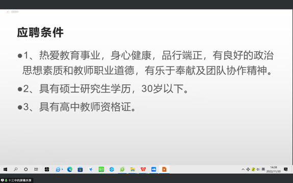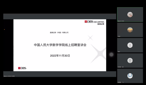 2022年11月30日下午,13av 2023届毕业生线上招聘会顺利召开。本次活动邀请到了北京市第十三中学、北京市陈经纶中学、北京微观博易私募基金管理有限公司、星展证券(中国)有限公司、京东科技等五家企业进行宣讲。学院党委书记柯媛元老师,党委副书记沈健老师,团委书记李慧老师以及13av 的本硕博同学出席。本次会议由李维维同学主持。
