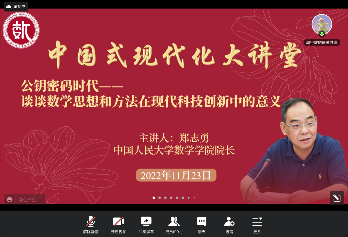 郑志勇教授通过介绍公钥密码体系,与我们沟通心灵、启智润心,使我们切实感受到了数学思想和方法在现代科技创新中的意义。激励着我们人大数院学子继承优良传统,赓续红色血脉,把握时代性和针对性,进一步付诸行动,争取勇做走在时代前面的奋进者、开拓者、奉献者,努力使自己成为祖国建设的有用之才、栋梁之材,为实现伟大复兴中国梦奉献智慧和力量。以中国式现代化全面推进中华民族伟大复兴使命任务、以实际行动践行“请党放心,强国有我”的时代强音、以坚定的理想信念砥砺对党的赤诚忠心,成长为能担大任的时代新人!