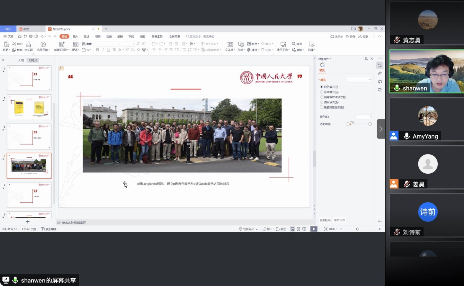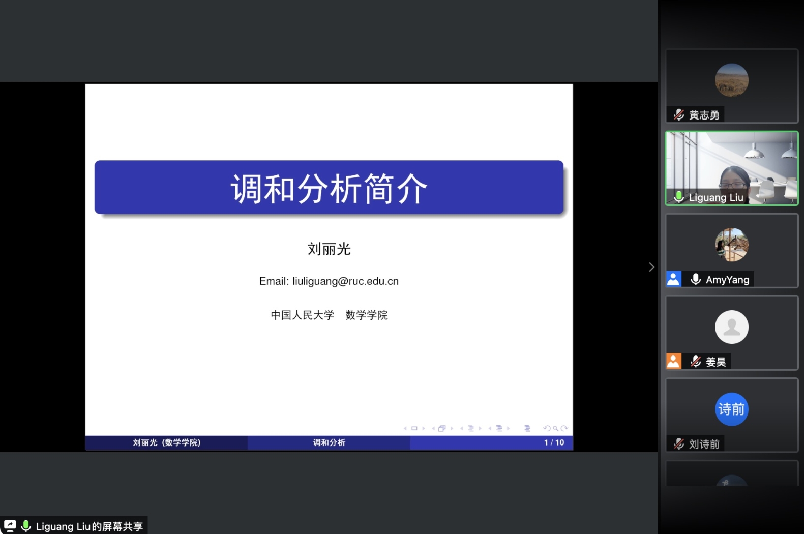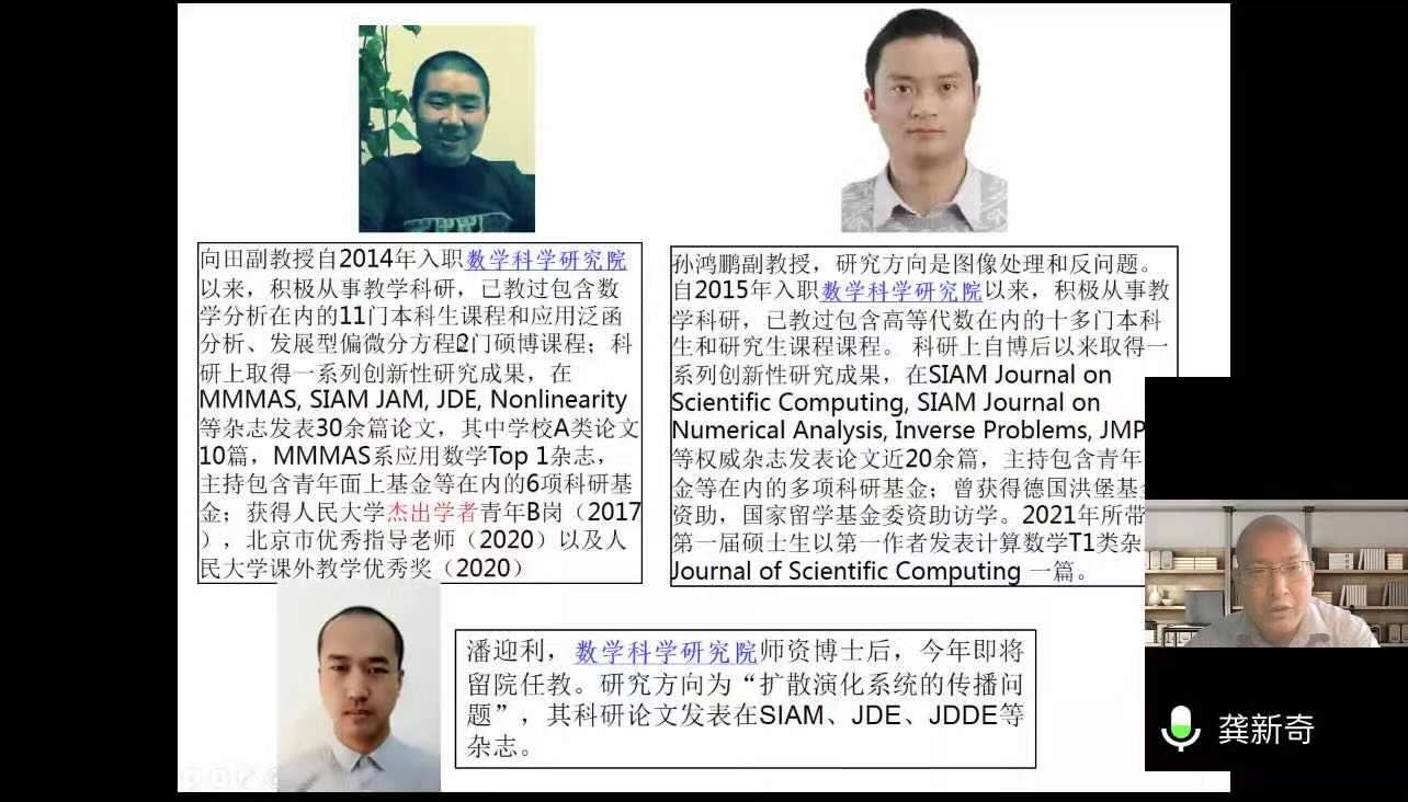 之后,各位老师依次介绍了人大数学学科的研究方向和领域。欧耀彬教授介绍了流体力学方向的相关研究;龚新奇教授介绍了生物数学方向与数学科学研究院的研究团队与研究内容;刘丽光教授针对调和分析方向做了详细介绍;王善文副教授就代数方向分享了独到见解并鼓励同学们努力做一名终身学习者;郑涛副教授介绍了复几何和复流形方向的研究进展;杨云雁教授期待大家能够在偏微分方程方向上快速进入状态并做出贡献;张庆彩教授介绍了以黎曼猜想为代表的复变函数方向;王伟教授就控制论方向做出了精彩的阐述,欢迎同学们加入13av 共同探索数学的魅力。